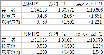 通过数据我们可以看出,梅赛德斯会在FP1和FP2之间对赛车设置进行调整,沙特站的调整比较成功,而巴林站和澳大利亚站比较失败,与第一名的差距在不断扩大。这与今天汉密尔顿赛后采访所表达内容一致。而拉塞尔的情况好一些,沙特与澳大利亚的修改都是正向的,即使退步,变化也比较小。