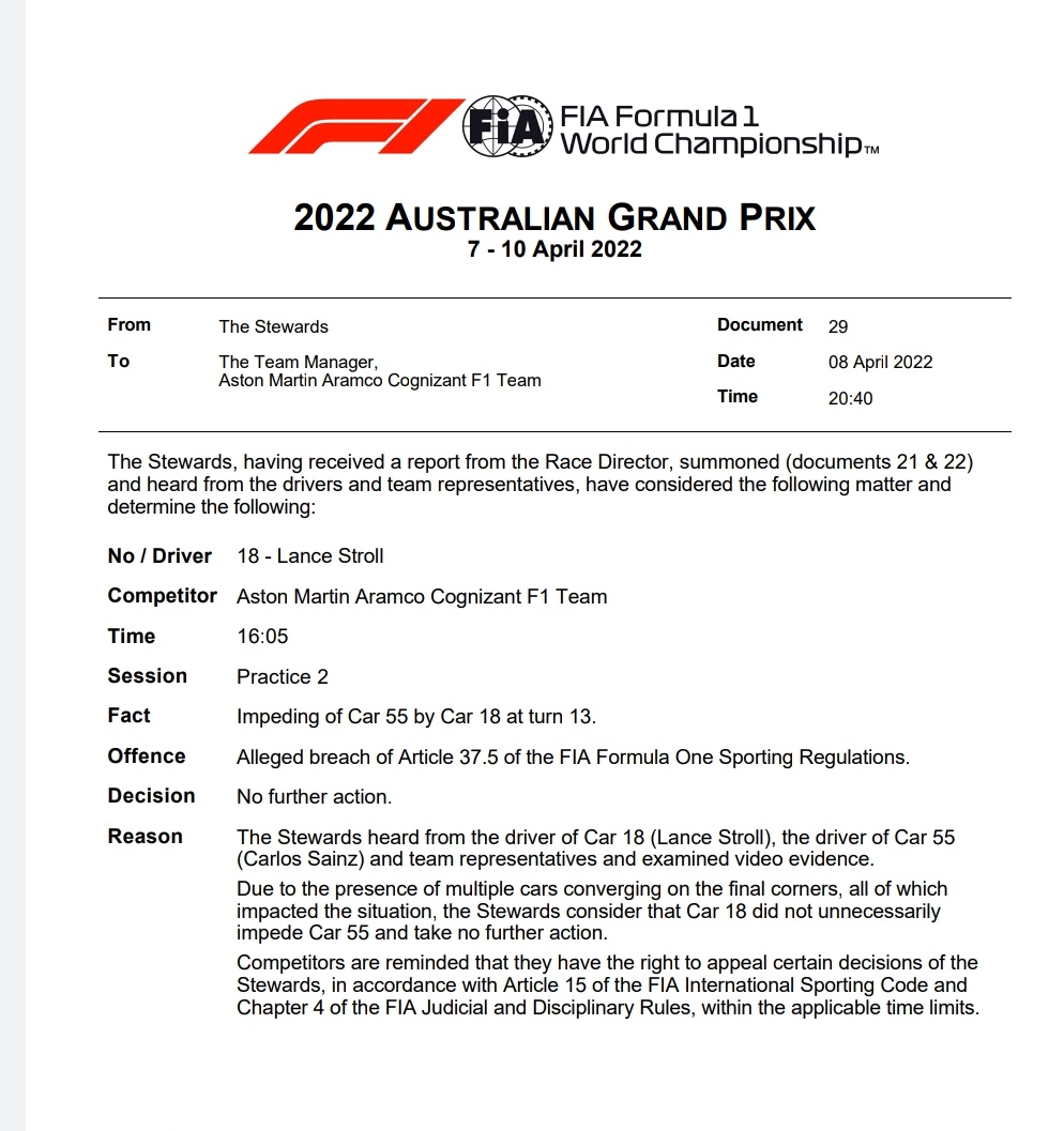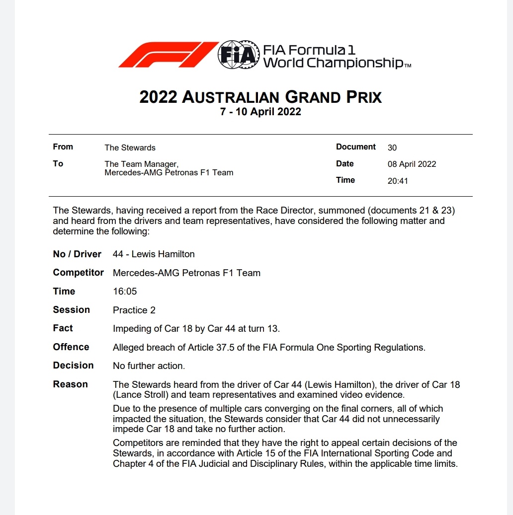 FIA发布声明,对二练期间斯托尔和汉密尔顿的阻挡行为,不做进一步判罚。