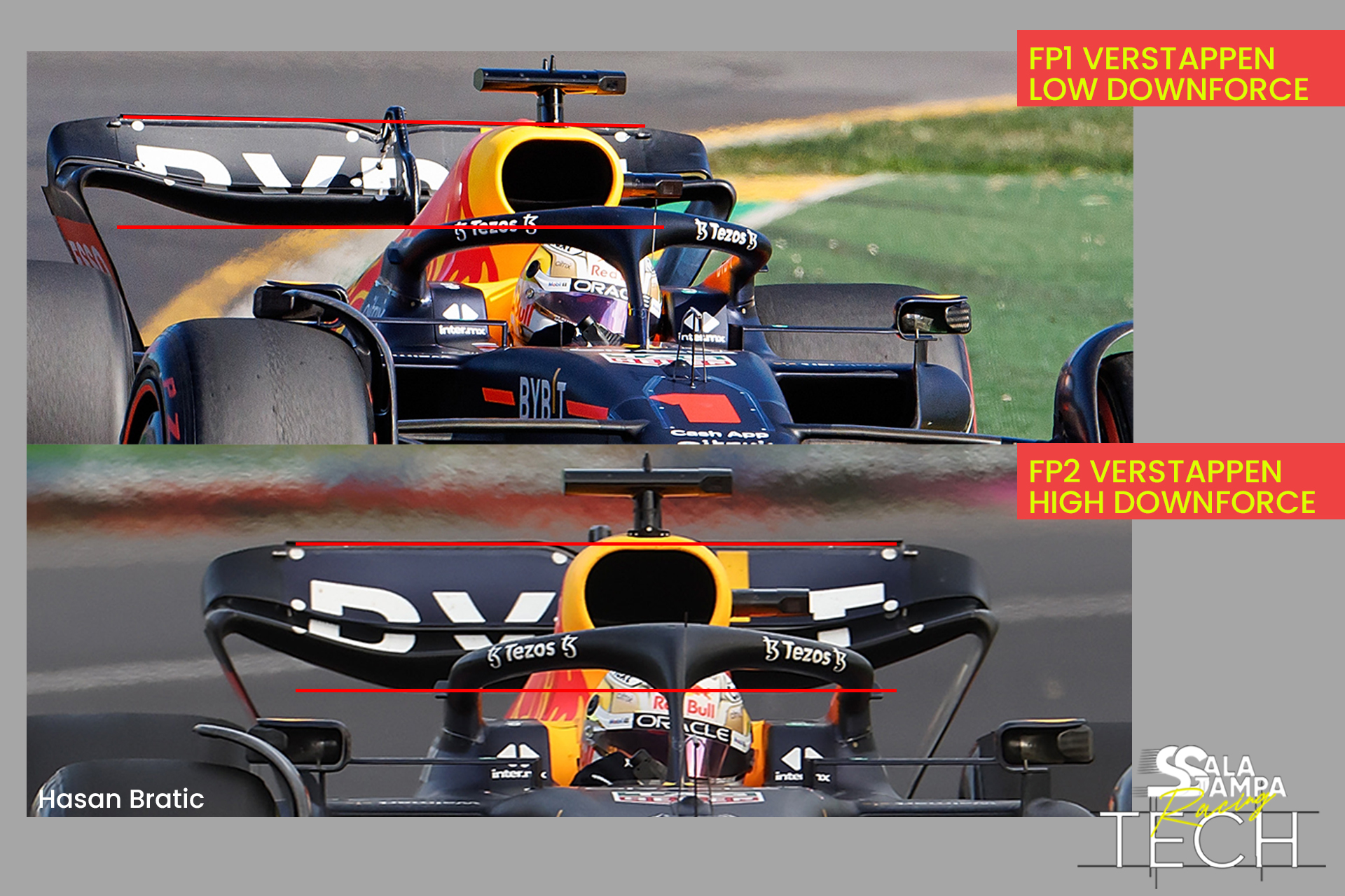 据Sala Stampa Racing报道,在今天进行的两次练习赛上,红牛让维斯塔潘测试了不同下压力的尾翼。一练时使用的是低下压力尾翼,二练换成了高下压力尾翼。