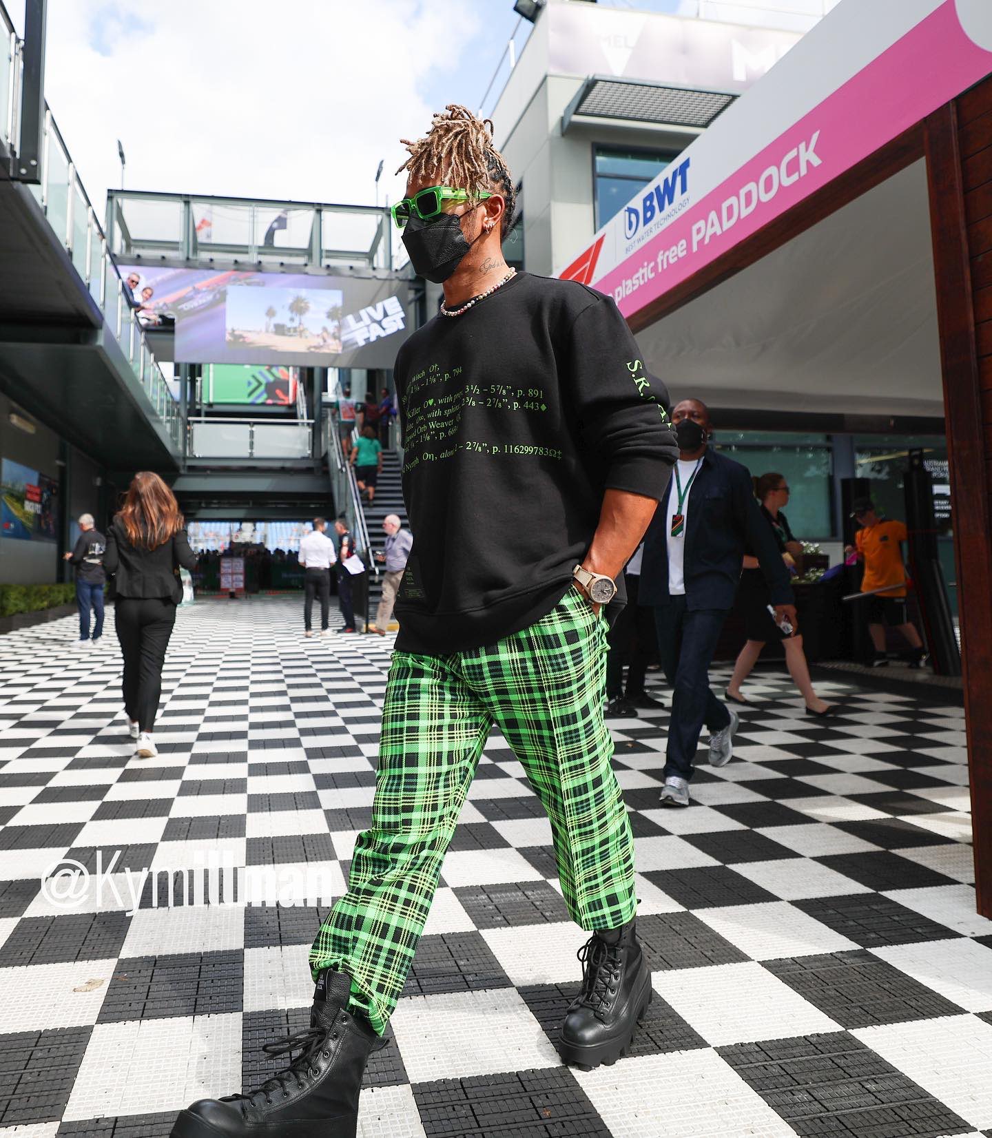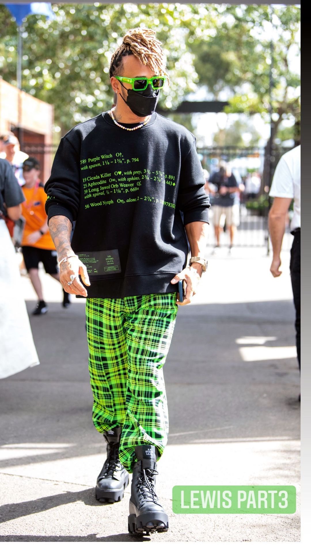 汉密尔顿今日佩戴绿色墨镜抵达围场