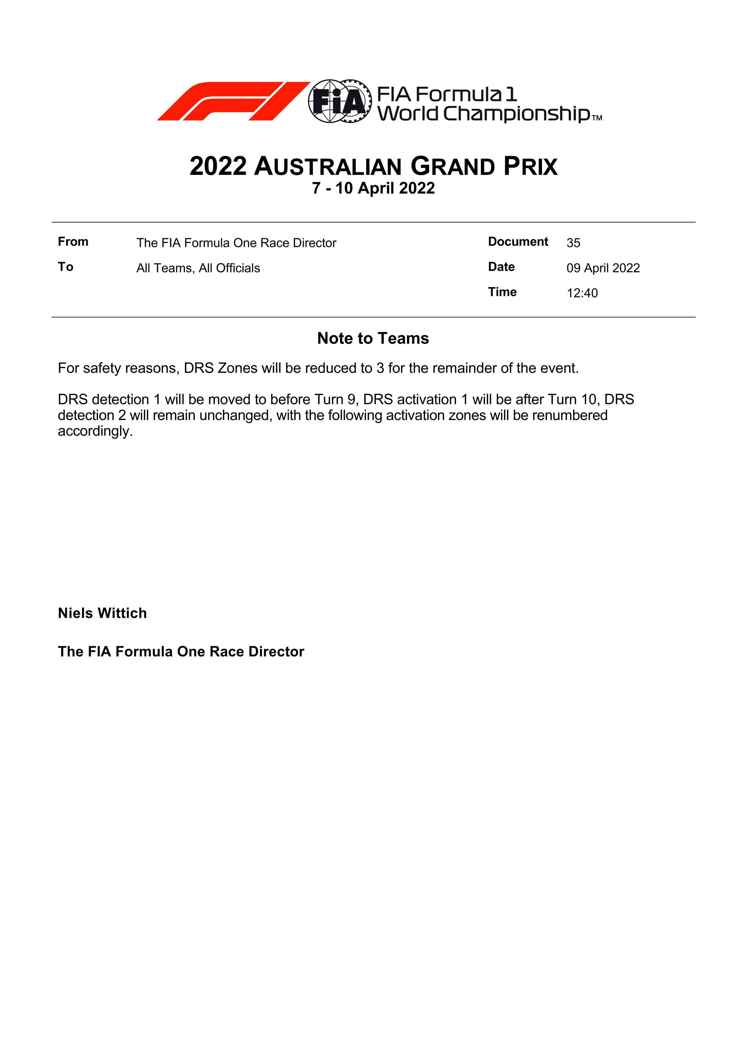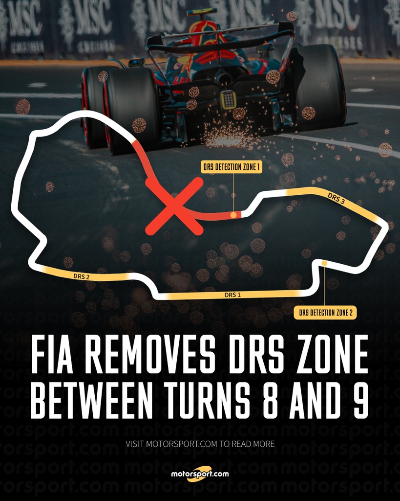 FIA发表文件:因安全原因,取消原先8号弯至9号弯的DRS区,本场DRS区减少至三个。