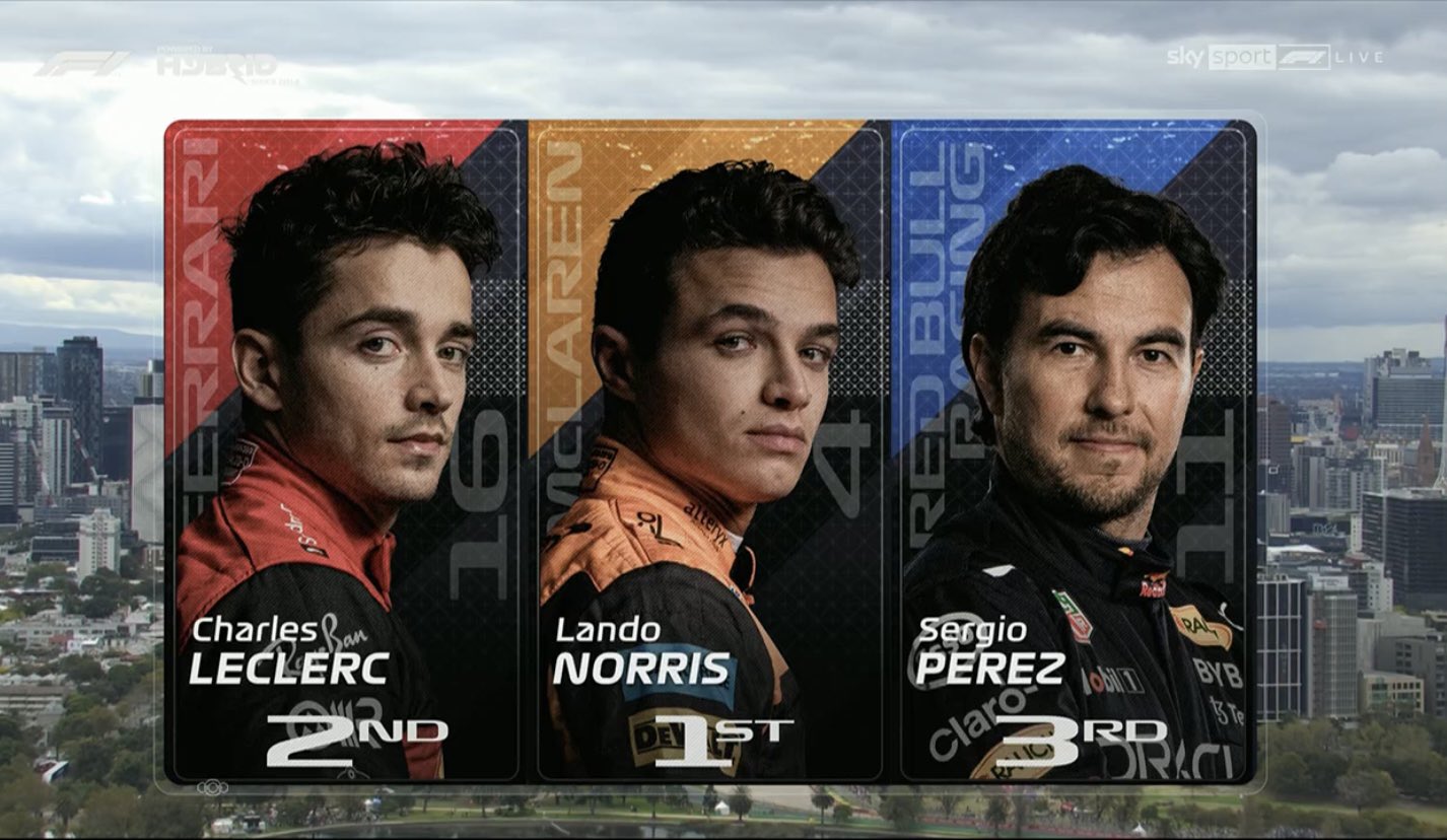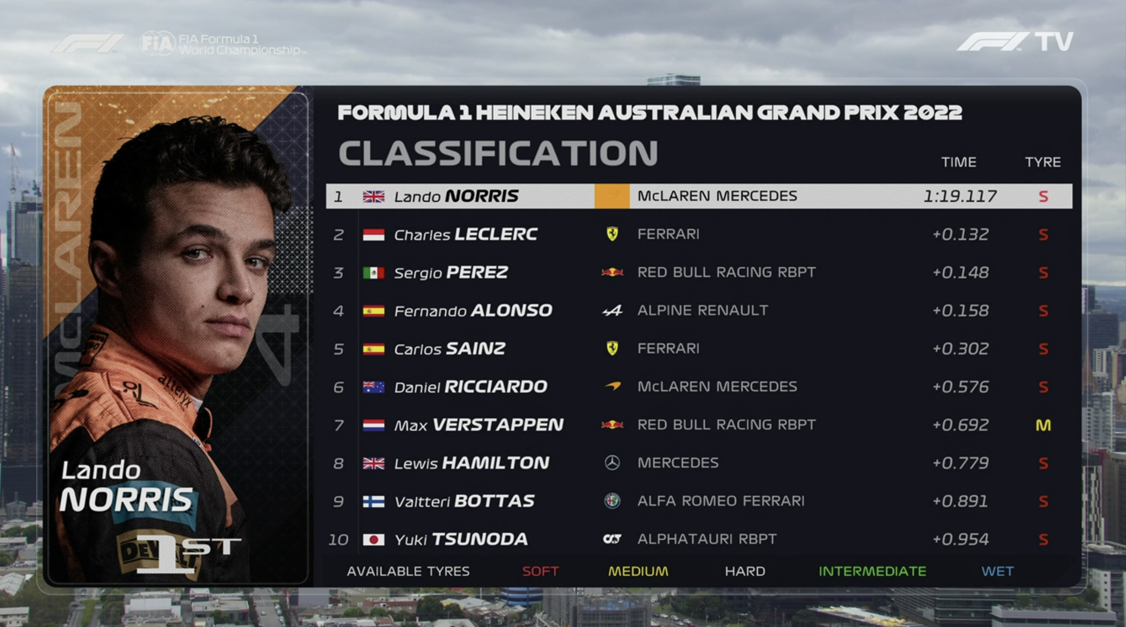 澳大利亚站FP3结束,诺里斯1:19.117排名第一,勒克莱尔1:19.249排名第二,佩雷兹1:19.265排名第三,维斯塔潘第七,周冠宇第十五,汉密尔顿第八,博塔斯第九。