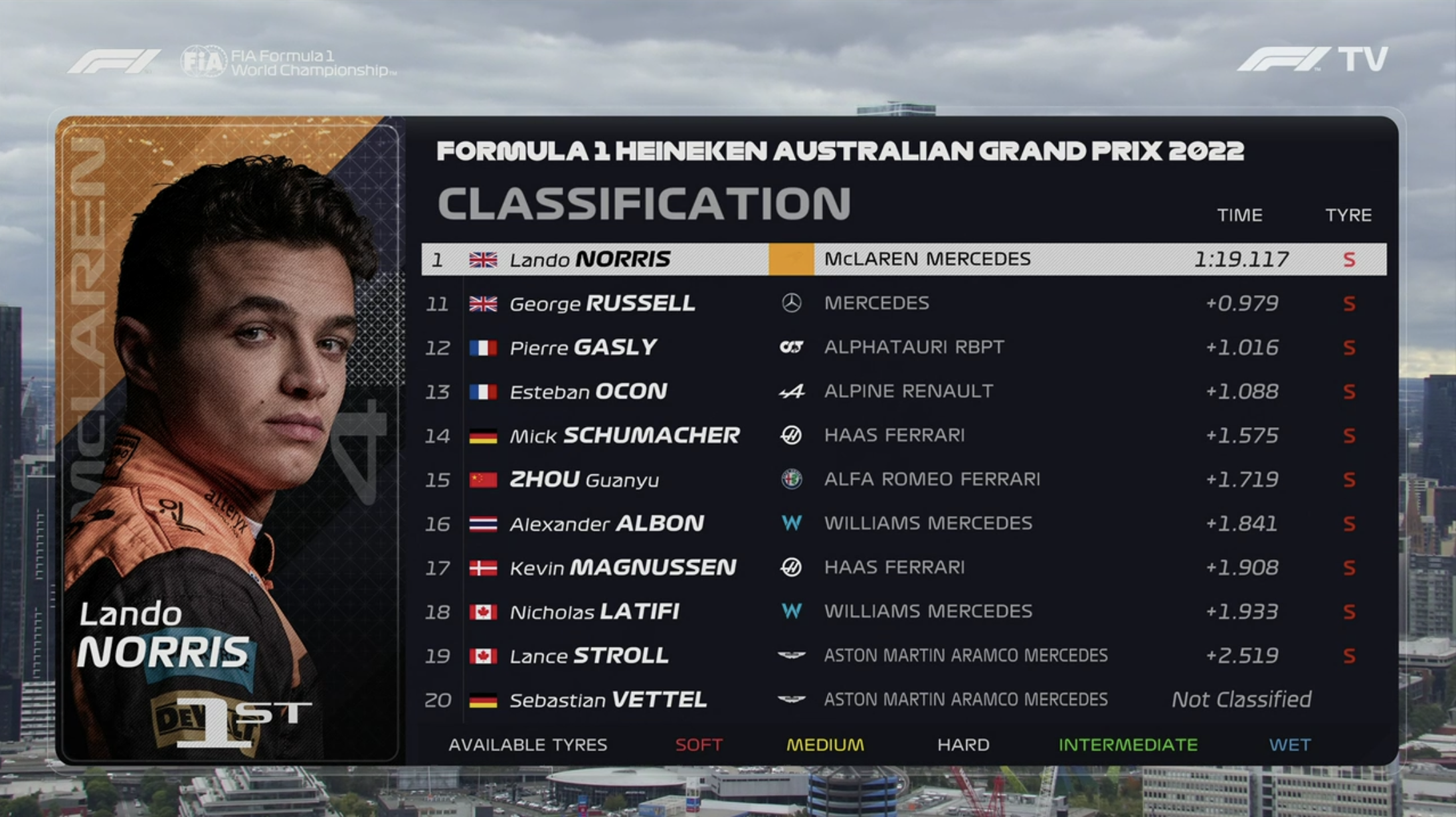 比赛进行了8分钟,赛道上只有诺里斯一辆车,他做出第一个有效成绩1:21.247,使用的是软胎。