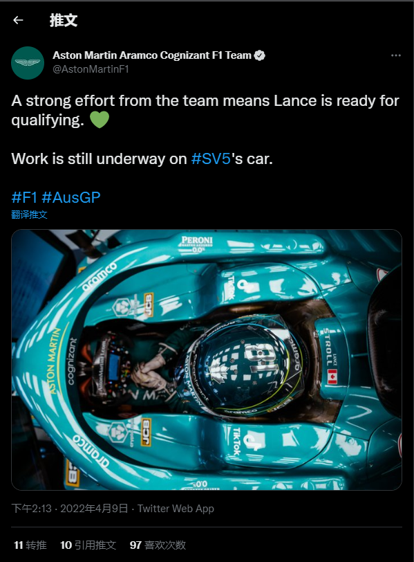 阿斯顿马丁官方推特更新,斯托尔的赛车已经修好出场,维特尔赛车还在修理中。