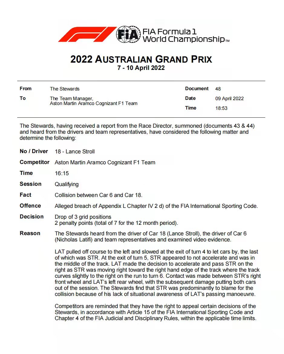 FIA在听取两位车手和车队的意见并回看录像后认为,斯托尔对拉提菲的赛车缺乏感知,负事故的主要责任。