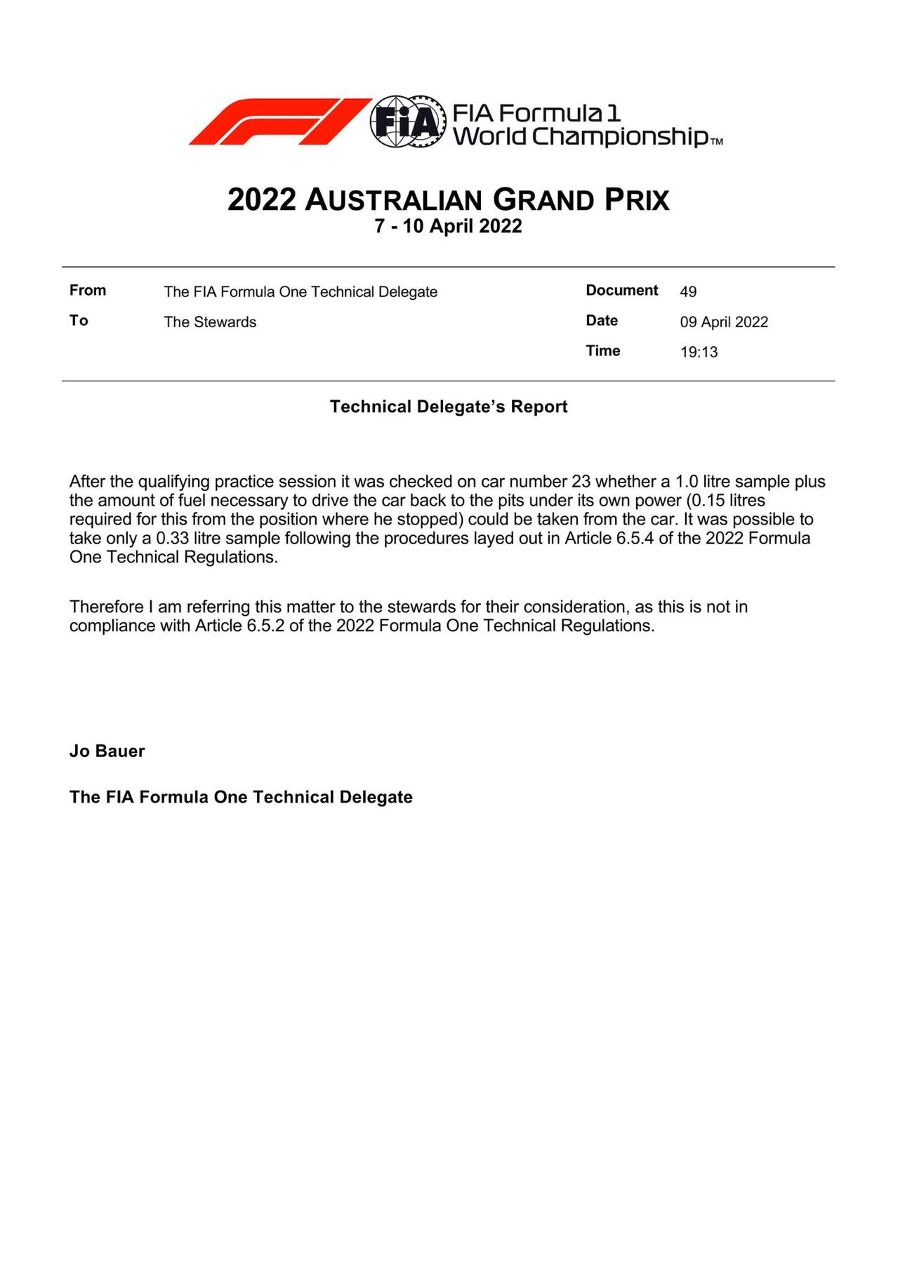 FIA发出文件显示,赛会从阿尔本赛车中只提取了0.33升燃油,未达到FIA要求的1升标准,因此可能会受到赛会处罚。