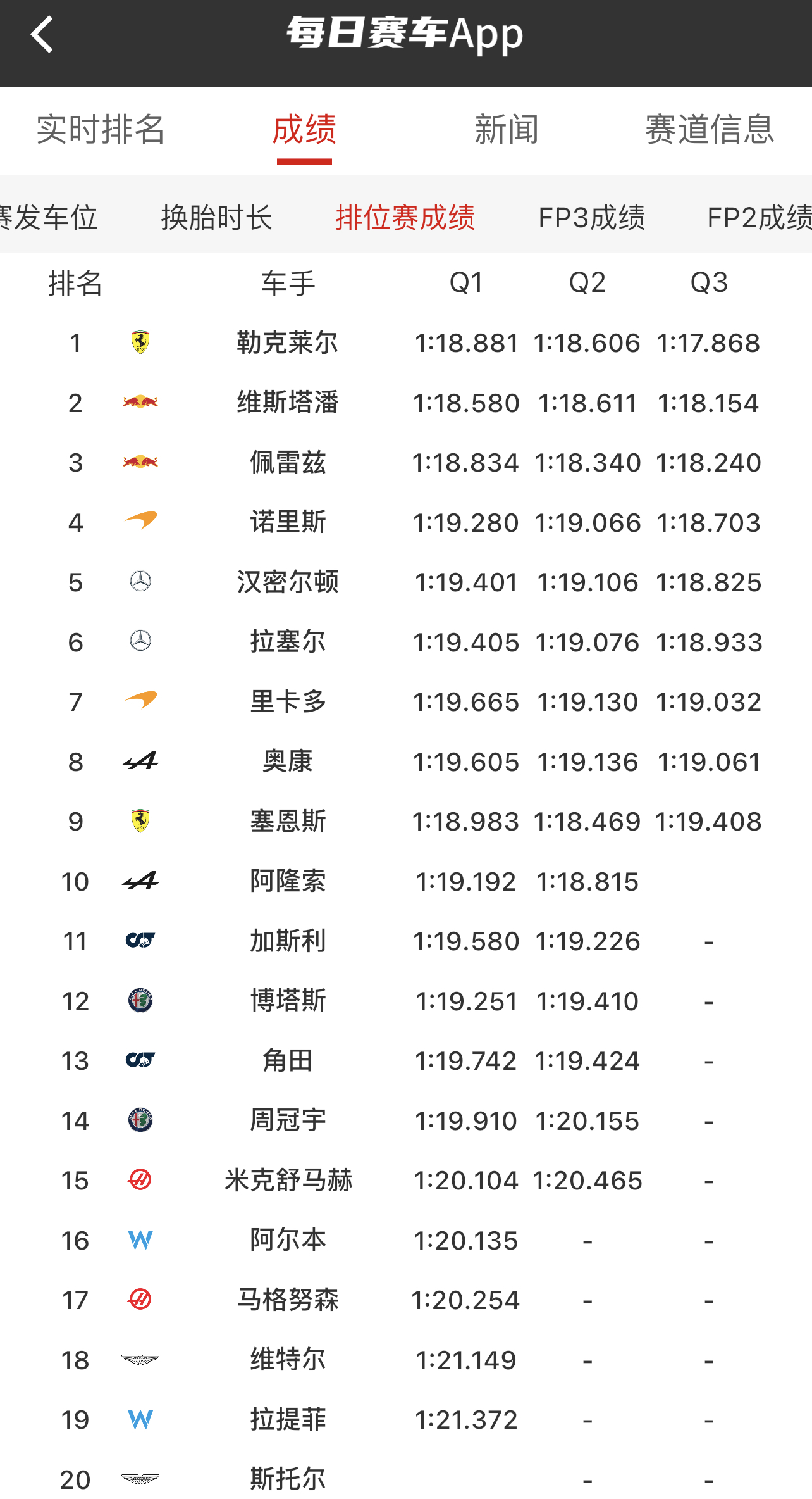 汉密尔顿和队友拉塞尔排在第5和第6名。迈凯伦两位车手表现也很亮眼,诺里斯排在第4,主场作战的里卡多也成功进入Q3,最终以第7名结束排位赛。