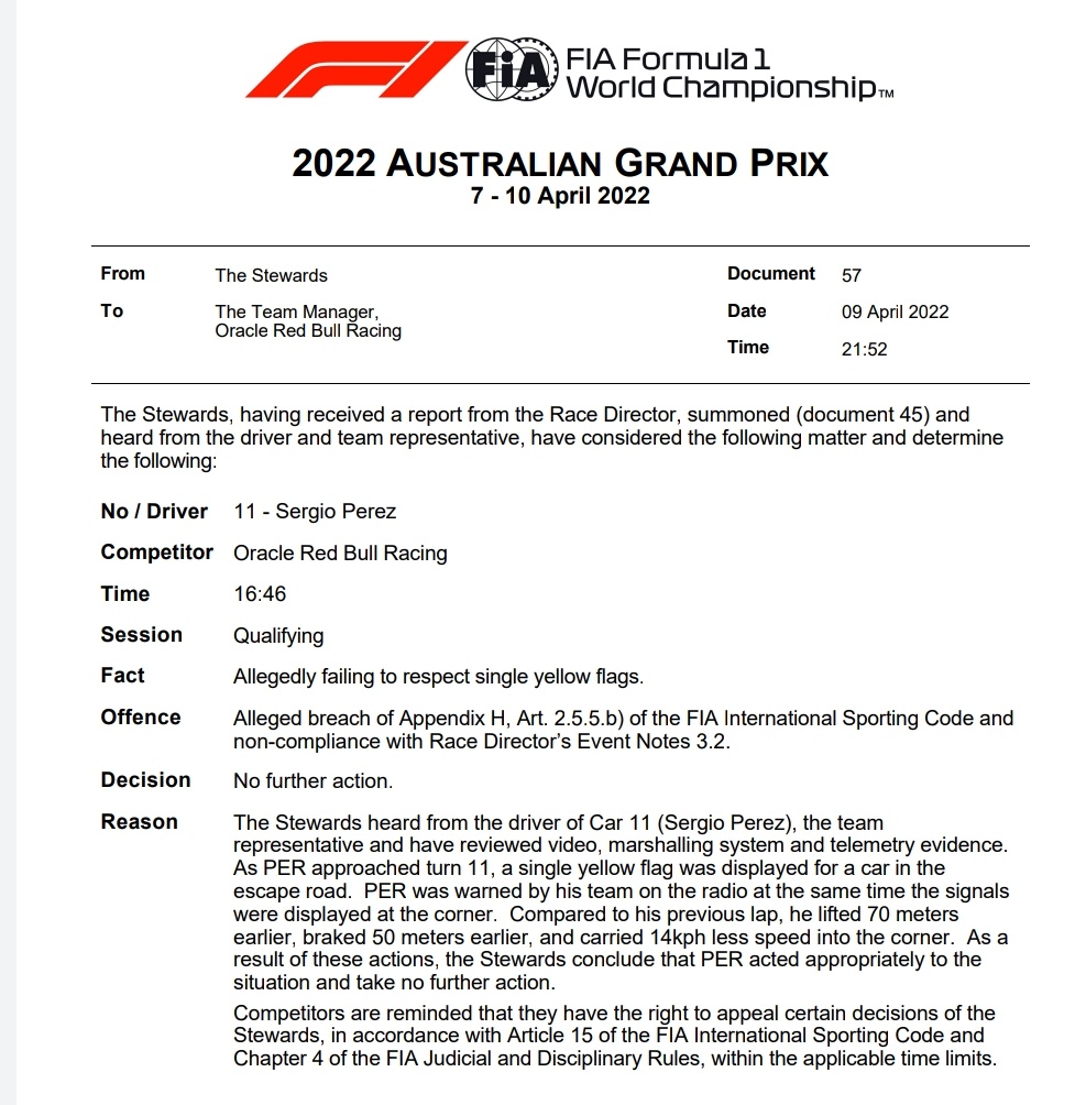 FIA文件中称,对排位赛上佩雷兹黄旗下未减速一事,将不做进一步处罚。