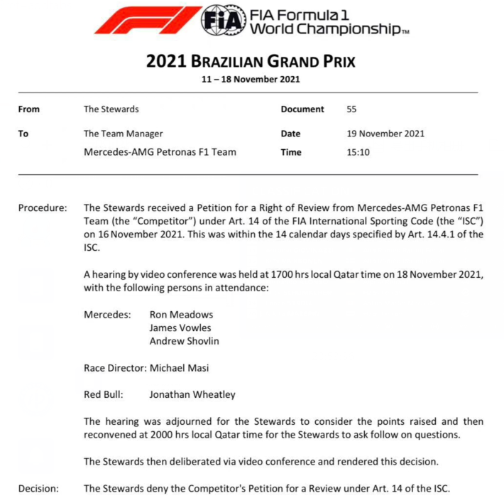 卡塔尔站赛前,梅赛德斯车队正式要求重审圣保罗站维斯塔潘的激烈防守事件。然而,在经过了将近一天的审议之后,FIA最终驳回了梅赛德斯的重审申请。