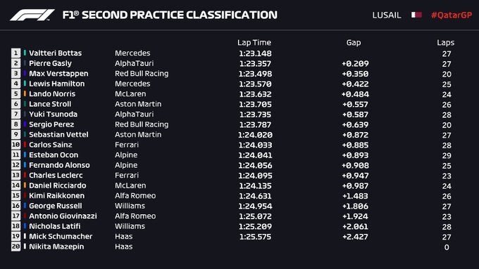 北京时间23:00,F1卡塔尔站第二次练习赛结束。梅赛德斯车手博塔斯做出1:23.148的全场最快单圈,小红牛车队的加斯利则连续第二节练习赛收获第二名。两位总冠军争夺者维斯塔潘和汉密尔顿分列3、4位。
