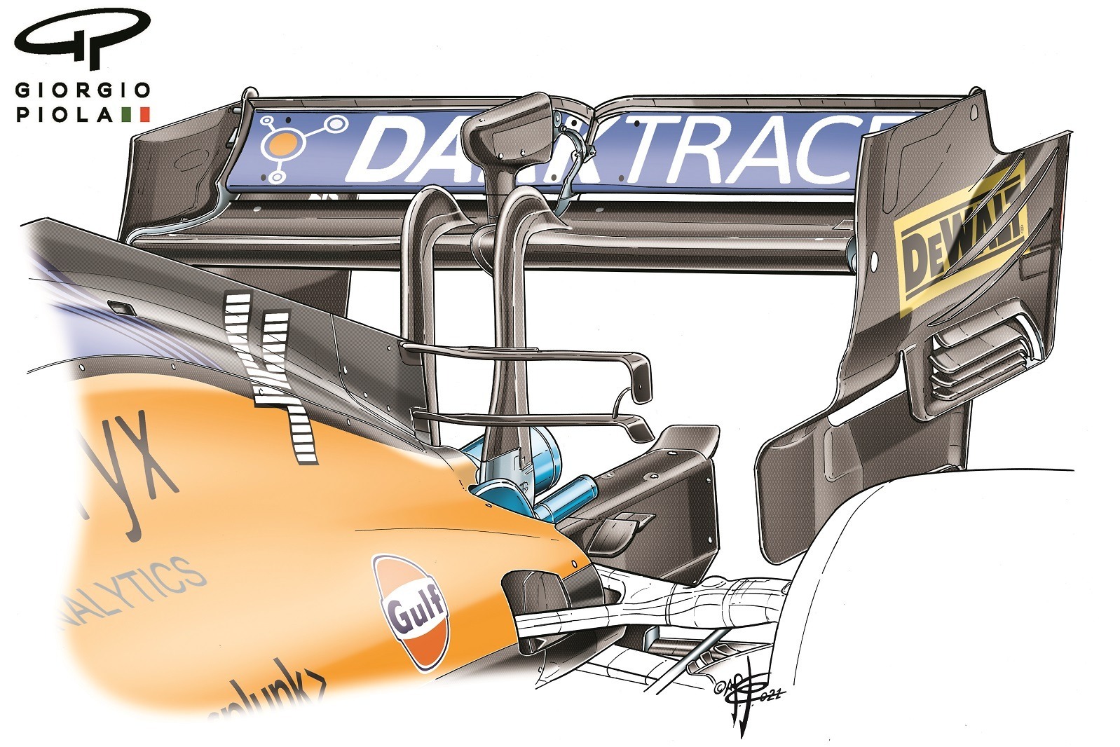 规则规定,尾翼翼片和水平线的缝隙应该在10mm到15mm之间,在DRS开启状态下应在10mm到85mm之间。为了更好地在车载镜头中监测尾翼状况,FIA本赛季初要求各支车队在尾翼上标上许多点。比如迈凯伦的在水平主翼片上标注上了白点,而在倾斜的翼片上标注上了黑点。