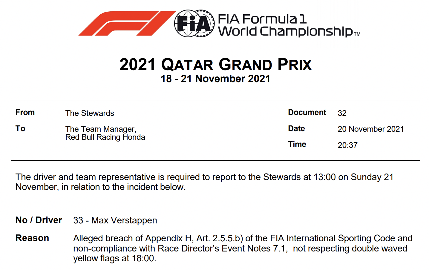 昨天的卡塔尔站排位赛Q3最后一轮飞驰圈,赛道出示黄旗,维斯塔潘因没在双黄旗状态下减速,赛后赛会干事要求他在当地时间13:00(北京时间18:00)前接受传唤。