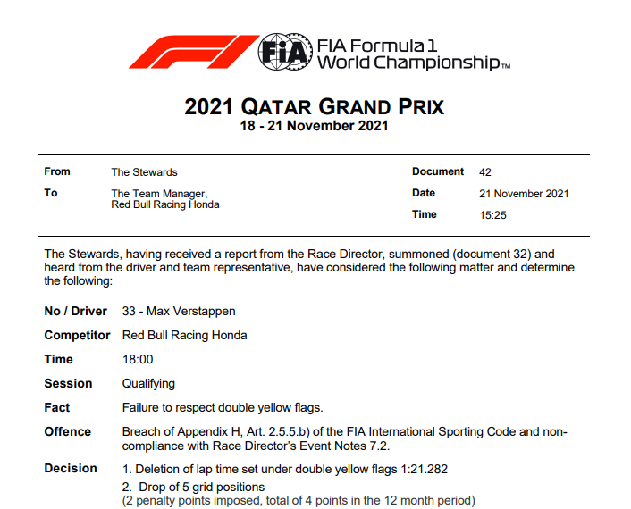 此外,红牛车手维斯塔潘因无视双黄旗被罚退后5位发车,同时超级驾照扣2分。