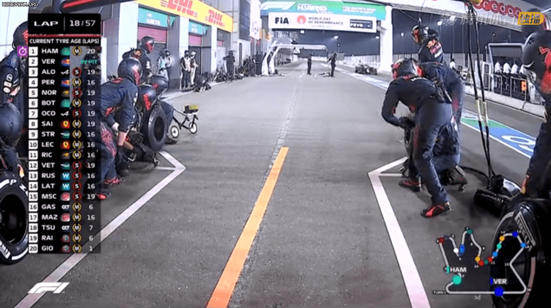 第18圈,维斯塔潘选择进站,换上硬胎,试图提前进站超越对手。