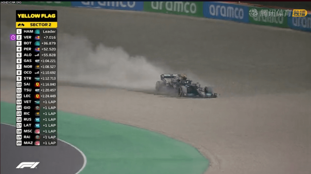 F1卡塔尔大奖赛第34圈,场上唯一没有进站的博塔斯发生爆胎!他顽强地回到了维修站,已经落到了第14位。