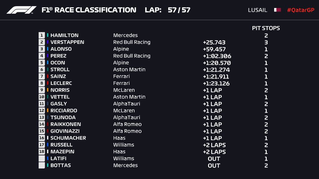 北京时间11月21日23:30,F1卡塔尔站正赛结束。汉密尔顿一骑绝尘领跑全场,被罚退的维斯塔潘起步后迅速来到第二,止损成功,并最终成功拿到最快圈。阿隆索策略成功,登上领奖台。汉密尔顿将和维斯塔潘的积分差距缩小到8分。