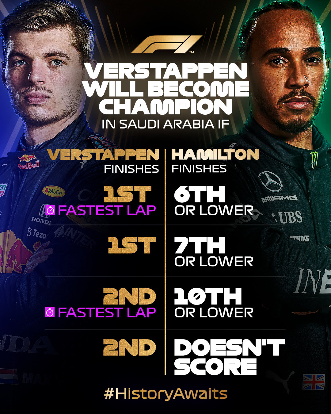 F1官方社交媒体已经算好了维斯塔潘在沙特大奖赛加冕世界冠军的条件,有四种情况: