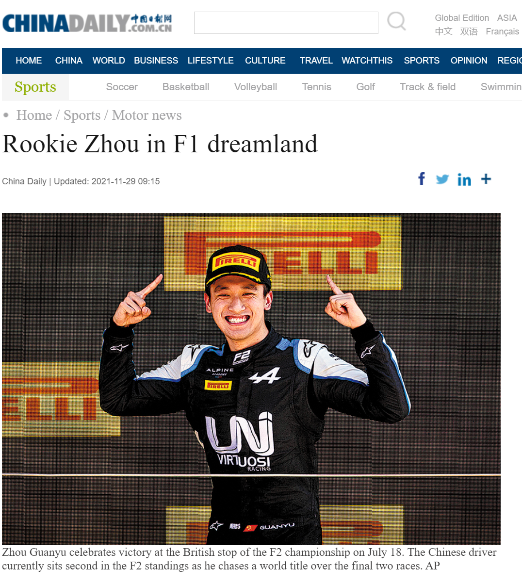 现在周冠宇正在努力工作,确保在首次F1赛季中让他自己、他的车队和他的祖国感到骄傲。