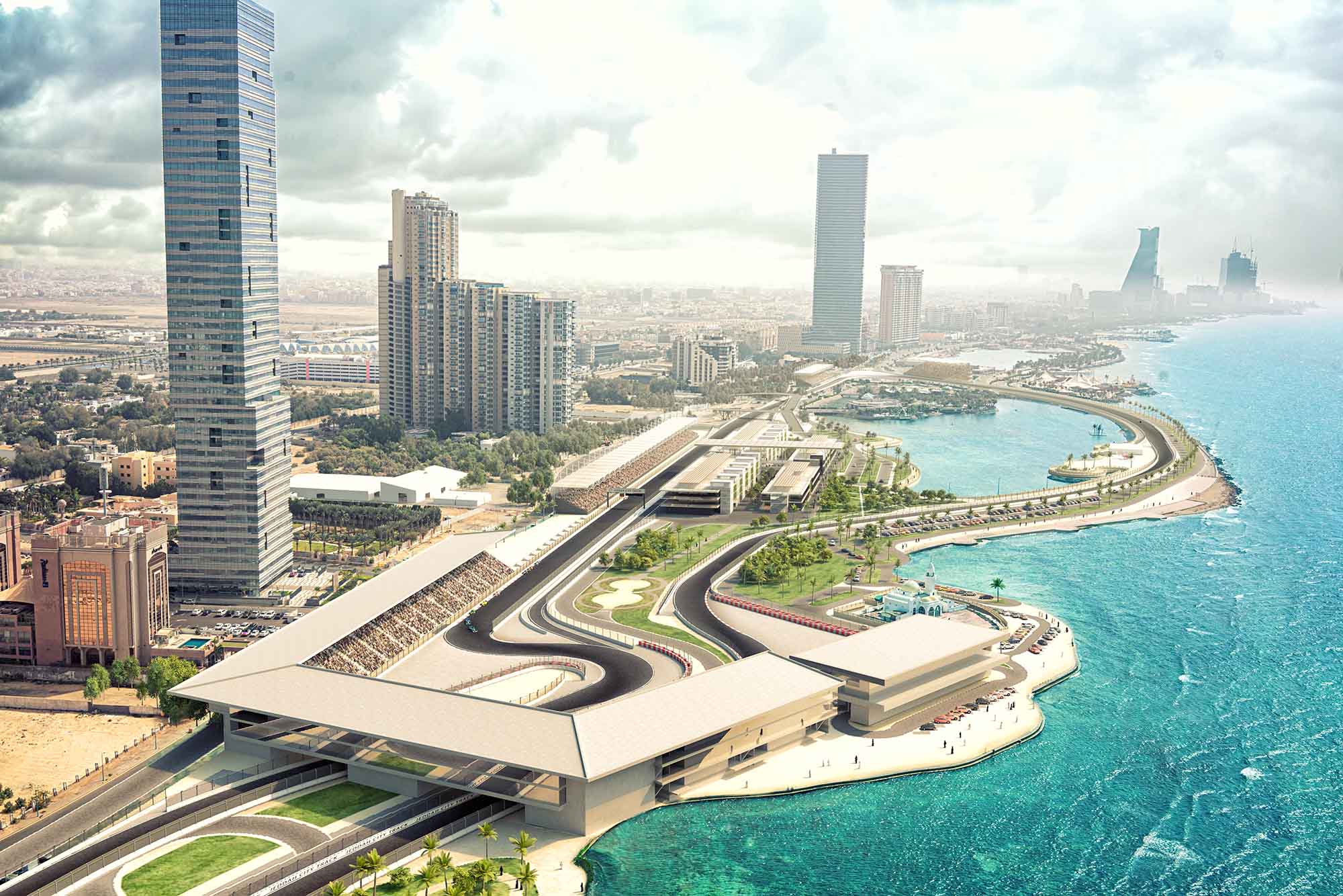 吉达赛道傍红海而建,向西是五彩缤纷的珊瑚礁,向北是一望无际的沙漠,向东则是耸立的山脉。赛道旁的小岛是多元文化的融合地,既有传统的寺庙,也有新建的游艇停靠区。赛道离市中心仅12公里。