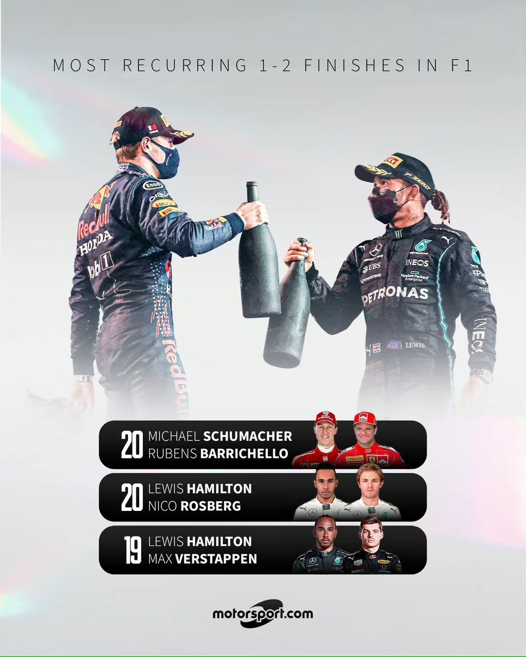 Motorsport数据显示,汉密尔顿和维斯塔潘在同场比赛中分别以1-2名完赛的次数为19次,还差一次他们就将追平前人的记录。