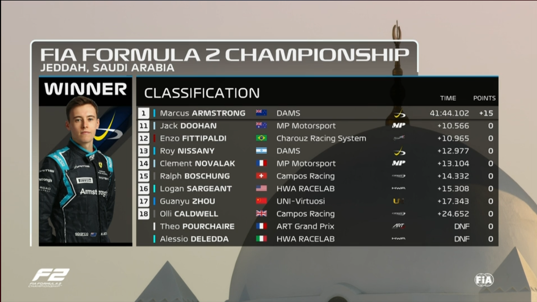 最终,阿姆斯特朗守住劳森夺得F2生涯首胜。提克图姆在最后一弯惊险超越皮亚斯特里,获得了最后一个积分。