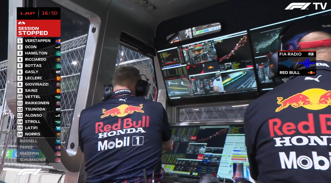 第一次红旗之后,再次起跑。汉密尔顿从第二名超过维斯塔潘,但维斯塔潘跑出赛道后切弯重新超回来!
