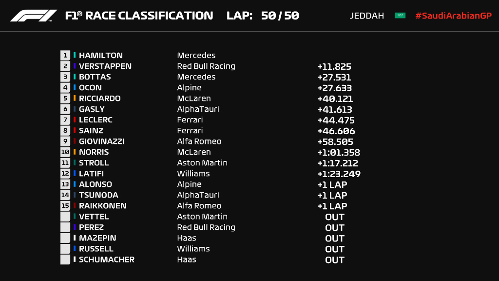 北京时间12月6日凌晨,F1沙特阿拉伯大奖赛落下帷幕。在这条全新的赛道上,事故频发,两次出现红旗,3次静态发车,胜利天平不断在冠军竞争者维斯塔潘和汉密尔顿之间摇摆。两人在比赛末期出现激烈多次缠斗。最终汉密尔顿夺得本站冠军,并带走最快圈的一分,两人带着完全相同的分数进入阿布扎比收官战。