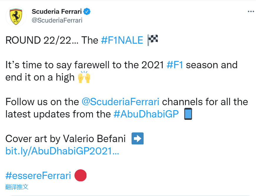 赛季第22站,法拉利车队发布海报,并配文:将以高排位和2021赛季说再见。